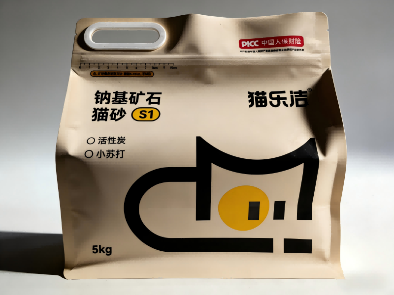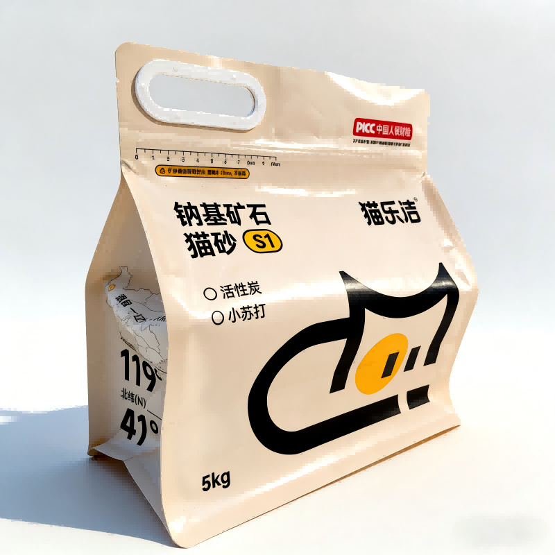 袋構造:8面シール構造により直立で安定した形状を実現し、棚陳列に最適です。再密封可能なジッパーと強化プラスチックのハンドグリップにより、5kgの猫砂を簡単に取り扱い、安全に保管できます。